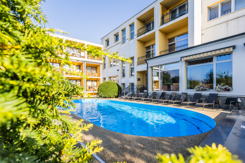 Hotel se nachází na klidném místě v blízkosti centra lázní, je tvořen 3 vzájemně propojenými budovami a nabízí tak komplexní služby pod jednou střechou.